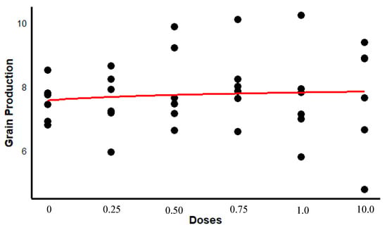 In addition to assessing grain yield in open fields, seedling growth parameters (plant height, root and shoot dry mass) were evaluated in a greenhouse experiment. The experimental setup involved growing soybean seeds in soil from the field with a history of low soybean productivity and comparing it to the same soil treated with varying doses of soybean-based inoculant applied to microbiolized seeds. This greenhouse experiment was carried out for 21 days in 5 kg pots using natural soil (not autoclaved). The data obtained for seedling growth parameters were compared using one-way analysis of variance (ANOVA) with the F test applied at a probability level of 10%, and grain yield data were compared using regression analysis as described in the Supplementary Materials. All statistical analyses were performed using R software version 4.0.3.