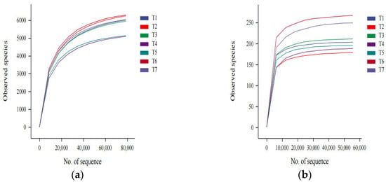 Bacterial (a) and fungal (b) sequencing dilution curves for the soil samples subjected to different treatments. Note: T1: Trichoderma harzianum + Bacillus subtilis + actinomycetes, T2: Trichoderma harzianum + Bacillus subtilis, T3: Trichoderma harzianum + actinomycetes, T4 (CK): water control, T5: Bacillus subtilis, T6: actinomycetes, and T7: Trichoderma harzianum. The following figures are the same representation.