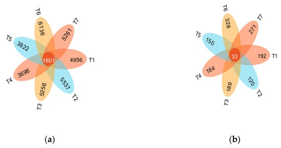 The Venn diagrams reflect the number of common and unique ASVs between different samples and intuitively show the overlap of ASVs between samples. According to the Venn diagrams of the bacterial and fungal ASV distributions (Figure 2), the number of ASVs shared by bacteria was 1601 in the rhizosphere soil samples from the seven treatments at 100% similarity. The numbers of ASVs specific to T1, T2, T3, T4 (CK), T5, T6 and T7 were 4956, 5537, 5256, 3696, 3822, 6136 and 5261, respectively, accounting for 45.65%, 39.63%, 39.73%, 28.37%, 34.01%, 43.01% and 40.05%, respectively, of the total number of ASVs in each sample. The number of ASVs shared by fungi was 33. The number of ASVs specific to T1, T2, T3, T4 (CK), T5, T6 and T7 were 192, 120,189, 164, 150, 328 and 271, respectively, accounting for 44.44%, 33.71%, 42.09%, 41.94%, 36.32%, 53.25% and 48.74%, respectively, of the total ASVs of each sample. The results revealed that the soil bacterial and fungal communities under treatments with different microbial agents presented certain differences. The number of bacterial ASVs in the soils treated with microbial agents was greater than that in the CK treatment, and the number of fungal ASVs was greater than that in the CK treatment, except in the T2 treatment (Trichoderma harzianum + Bacillus subtilis).