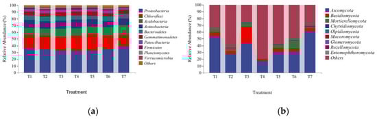 Analysis of the species compositions of the soil bacterial (a) and fungal (b) communities at the phylum level under different treatments.
