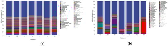 Analysis of the species compositions of the soil bacterial (a) and fungal (b) communities at the genus level under different treatments.