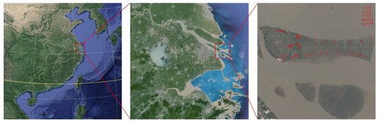 The study site is located on Hengsha Island, Shanghai (N 31°16′–31°23′, E 121°47′–122°9′), and is characterized by a subtropical monsoon climate, with an average annual temperature of 15.4 °C. With an average annual rainfall of 1100 mm and 2200 h of sunshine annually, the island, formed by sediment deposition from the Yangtze River at the eastern end of its estuary, covers a total area of 60 km2, including 26.8 km2 of arable land. Historically, due to persistent wind and wave erosion along with tidal action, the island has undergone a southeast subsidence evolution pattern characterized by a northwestward rising trend, gradually migrating northwestward, albeit with a net increase in overall area. Since the implementation of the sea pond reinforcement and shore protection project in 1958, erosion along the island’s southern coast has been mitigated, resulting in stabilized shorelines and tidal flats.