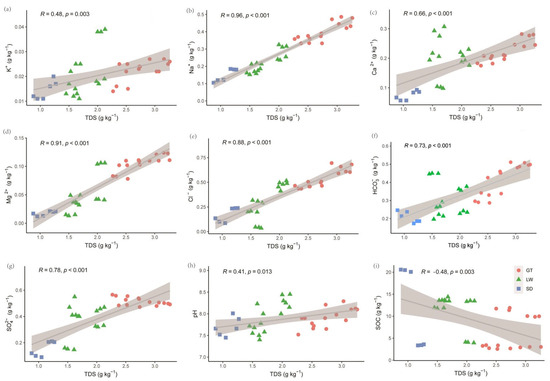 Variations in Pearson correlation coefficients among soil parameters: K+ (a), Na+ (b), Ca2+ (c), Mg2+ (d), Cl− (e), HCO3− (f), SO42− (g), pH (h), SOC (i), and TDS across different vegetation cover types. GT: bare flat; LW: reed bed; SD: rice field.