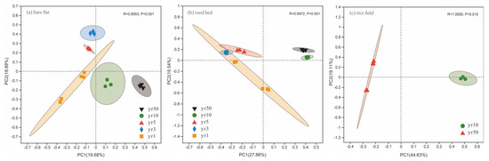 Principal coordinates analysis (PCoA) of soil bacterial communities at the ASV level across reclamation years (yr1, yr3, yr5, yr10, and yr50) in tidal flats. (a) Bare flat; (b) reed bed; (c) rice field.