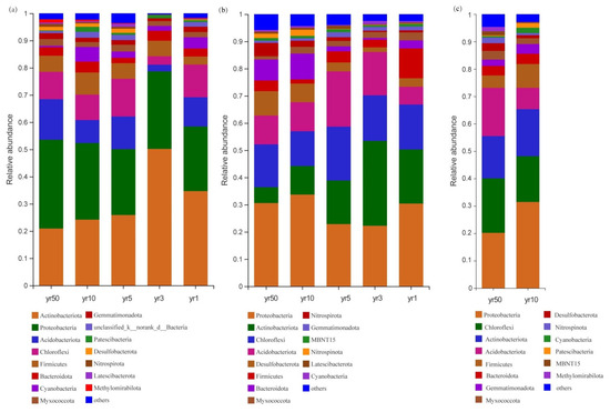 Community composition of soil bacterial phyla in tidal flats across different reclamation years (1, 3, 5, 10, and 50) and vegetation cover types. (a) Bare tidal flat; (b) Reed bed; (c) Rice field. Taxa with relative abundances < 0.01 are grouped as “others”.