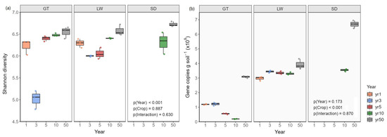 Variations in (a) bacterial Shannon diversity index and (b) gene copy numbers in tidal flat soils across different reclamation years (1, 3, 5, 10, and 50) and vegetation cover types. GT: bare tidal flat; LW: reed bed; SD: rice field.