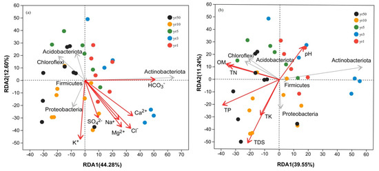 Redundancy analysis (RDA) of soil bacterial communities at the phylum level in relation to selected environmental variables. (a) Correlation between soil salinity ion composition and bacterial community structure. (b) Correlation between major soil chemical properties and bacterial community structure. Colored points represent samples from different reclamation years (1, 3, 5, 10, and 50). Grey arrows indicate species, while red arrows indicate environmental variables.