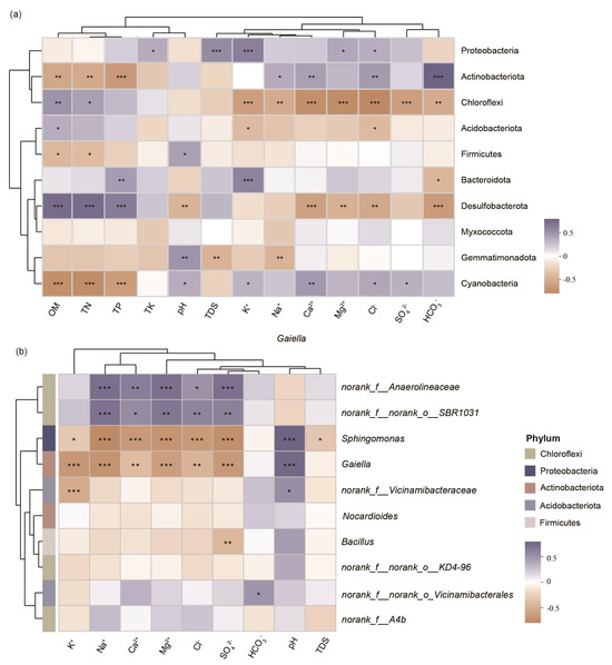 Taxonomically, Actinobacteriota showed a strong positive correlation with HCO3− (p < 0.001) but significant negative associations with OM, TN, and TP (p < 0.01), while Proteobacteria were predominantly linked to K+ and TDS (p < 0.001), consistent with their osmoadaptive strategies (Figure 7a). In contrast, Chloroflexi exhibited consistent negative correlations with dominant salinity ions (p < 0.01), suggesting a generalized sensitivity to ionic stress. At the genus level (Figure 7b), Sphingomonas (Proteobacteria) and Gaiella (Actinobacteriota) showed strong antagonism toward most salinity ions, contrasting with their respective phylum-level trends. In parallel, unclassified taxa such as norank_f_Anaerolineaceae (Chloroflexi) and norank_f_norank_o_SBR1031 (Chloroflexi) demonstrated unexpected positive correlations with salinity ions, indicating niche-specific adaptations diverging from their phylum’s overall salt-avoidance strategy.