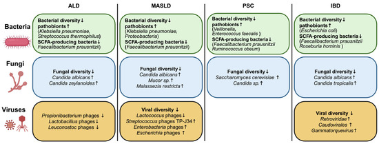 Assessing the microbiome signatures in patients (adults or children) with gut and liver diseases vs. healthy controls, it is very evident that these diseases cause dysbiosis, with an increased enrichment of pathobionts (e.g., Klebsiella, Enterococcus, Veillonella, etc.) and a decreased abundance of gut commensals [67]. These diseases decrease the overall bacterial diversity in the gut [68]. Certain beneficial bacteria, especially the SCFA producers (e.g., F. prausnitzii, Roseburia, Ruminococcus, etc.), are shown to be affected in ALD, MASLD, and IBD. Similarly, the mycobiome signature is also greatly reshaped in the underlying liver and gut diseases. Among the population of gut fungi, various species of Candida, especially Candida albicans, have been linked to ALD, MASLD, PSC, and IBD. Consequently, the composition of the core intestinal virus population (eukaryotic viruses and bacteriophages) also changes, which potentially plays a role in the progression of these diseases [69]. However, the exact conclusion of these virome changes is still unclear and needs further investigation. The common alterations of the bacterial, fungal, and viral microbiome in ALD, MASLD, PSC, and IBD have been summarized in Figure 1.
