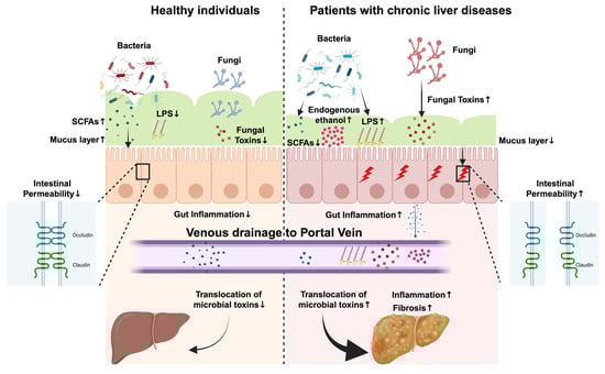 Common pathophysiological steps in chronic liver disease related to microbial products affecting the gut barrier. A comparative analysis between normal intestinal homeostasis in healthy individuals and the dysregulated state in patients with chronic liver diseases. In healthy individuals, an intact gut barrier prevents the translocation of microbial toxins into the bloodstream. Furthermore, the production of short-chain fatty acids (SCFAs) by commensal bacteria provides a protective, anti-inflammatory environment in the gut. In contrast, dysbiosis of the gut microbiome (increased abundance of pathobionts and decreased abundance of beneficial microbes, including SCFA producers) and a related increase in toxic microbial products lead to intestinal epithelial injury (e.g., disruption of tight junctions), chronic inflammation, and gut barrier dysfunction in patients with chronic liver diseases. This facilitates the translocation of microbial toxins [lipopolysaccharides (LPSs), ethanol, and fungal toxins] from the gut to the liver via the portal circulation, contributing to hepatic inflammation and fibrosis. ↑ denotes increase, whereas ↓ denotes decrease. Created with a license from biorender.com.