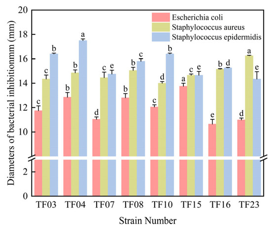 Among the eight probiotic strains evaluated, TF15, TF04, and TF08 exhibited superior inhibitory effects against E. coli, with inhibition zone diameters of 13.75 ± 0.24 mm, 12.85 ± 0.21 mm, and 12.80 ± 0.17 mm, respectively. Meanwhile, TF23, TF16, TF08, and TF04 manifested robust antibacterial activity against S. aureus, producing inhibition zones of 16.25 ± 0.19 mm, 15.15 ± 0.23 mm, 15.05 ± 0.24 mm, and 14.85 ± 0.21 mm, respectively. Notably, TF04 displayed the highest inhibitory efficacy against S. epidermidis, with an inhibition zone diameter reaching 17.50 ± 0.18 mm.