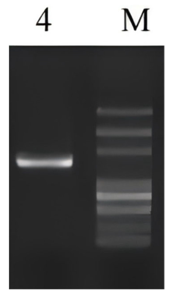 Results of agarose gel electrophoresis. Lane 4 represents probiotic strain TF04. The DNA marker (M) lanes, from top to bottom, correspond to 5000, 3000, 2000, 1000, 750, 500, 250, and 100 bp, respectively.
