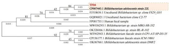 Phylogenetic tree analysis demonstrated that strain TF04 showed the closest evolutionary relationship with Bifidobacterium adolescentis strain 22L, followed by Bifidobacterium sp. FS29_G01. Through 16S rRNA gene sequencing analysis, strain TF04 was identified as belonging to the genus Bifidobacterium. Although 16S rDNA gene analysis did not support its classification as a novel species, strain TF04 demonstrated unique antimicrobial properties. Therefore, this isolated strain has been provisionally designated as Bifidobacterium sp. strain TF04 (GenBank accession No. PQ637525) for subsequent functional characterization. For long-term preservation and scientific reference, this strain was designated as Bifidobacterium jiwang and deposited in the China General Microbiological Culture Collection Center (CGMCC) on 14 November 2024, with the accession number CGMCC No. 32629.
