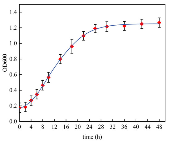 Following an initial 4 h incubation period, strain TF04 entered the logarithmic growth phase (OD600 = 0.268 ± 0.061), demonstrating rapid proliferation and growth. Subsequently, after 26 h of incubation, the strain transitioned into a stabilization phase (OD600 = 1.198 ± 0.052), with the final OD600 value stabilizing at around 1.220.