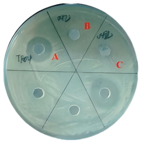 Exclusion of organic acids of inhibitory active substances of Bifidobacterium sp. strain TF04. Region A is the experimental results of the bacteriostatic agent produced by Bifidobacterium sp. strain TF04. Region B is the antibacterial properties of acetic acid. Region C is the antibacterial properties of lactic acid.