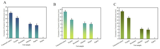 After treatment with different proteases, the antibacterial properties of the bacteriostatic agents exhibited varying degrees of decline. Notably, the antibacterial activity was completely lost after treatment with Pepsin and Protease K. Specifically, the antibacterial activity of Papain treatment on E. coli, S. aureus, and S. epidermidis decreased to 51.3%, 54.4%, and 33.3%, respectively. After treatment with Alkaline protease, the antibacterial activity against E. coli, S. aureus, and S. epidermidis decreased to 56.6%, 57.3%, and 36.0%, respectively. Notably, bacteriostatics exhibited the lowest sensitivity to Trypsin. Following Trypsin treatment, the antibacterial activity against three indicator bacteria still retained above 70%.