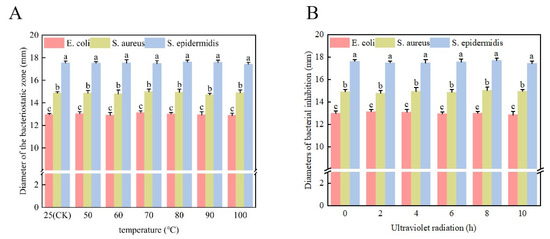The antibacterial agent was subjected to thermal stability testing at 50 °C, 60 °C, 70 °C, 80 °C, 90 °C, and 100 °C for 30 min each. Additionally, ultraviolet stability was assessed by exposing the bacteriostatic agent to ultraviolet light for 0 h, 2 h, 4 h, 6 h, 8 h, and 10 h, respectively. The experimental outcomes are illustrated in Figure 8.