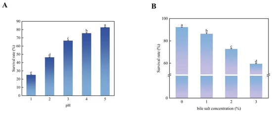 The pH of MRS medium was adjusted to 1.0, 2.0, 3.0, 4.0, and 5.0. Then, the activated strains were inoculated into the MRS medium with different pH at 3% (v/v) and cultured at 37 °C for 5 h. After treatment, bacterial survival rates were quantified via serial dilution and plate counting. Briefly, cultures were diluted 10-fold serially in sterile PBS, plated on MRS agar, and incubated at 37 °C for 24 h. The untreated bacterial strain was used as the control, and colonies numbering between 30 and 300 were selected for valid counting.
