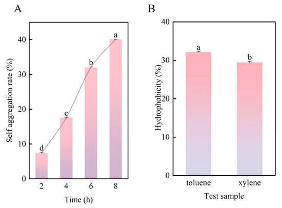 The strains were inoculated in MRS liquid medium and cultured at 37 °C for 24 h. Following incubation, the culture was centrifuged at 6000 rpm for 5 min using a high-speed centrifuge to harvest the cells. The cells were washed three times with PBS and then resuspended to an OD600 of 0.7. The initial absorbance (Abi) was recorded. The bacterial suspension was mixed with toluene or xylene in a ratio of 3:1. The aqueous phase was separated by incubation for 70 min at 37 °C in a constant temperature incubator, and its absorbance was detected at 600 nm (Abf).