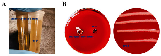The strains were inoculated on the Colombian blood agar plate and cultured at 37 °C for 24 h. The presence of a clear transparent zone around the colony was observed. A grass green ring indicated α hemolysis, while a completely transparent hemolysis ring surrounding the colony signified β hemolysis. The absence of any change in the culture medium around the colony indicated γ hemolysis, representing no hemolysis. Staphylococcus aureus was used as a positive control.