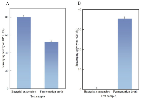 The scavenging ability of bacterial solution to hydroxyl radicals was determined by Fenton reaction system. Control group () comprised 1 mL brilliant green (0.435 mmol/L), 1 mL FeSO4 (2.5 mmol/L), 1 mL H2O2 (3.0%), 1 mL ddH2O, and 1 mL PBS. Blank group () involved replacing H2O2 in group with ddH2O2. Sample group () entailed substituting ddH2O in group with fermentation supernatant or bacterial suspension. All groups were incubated in the dark at 37 °C for 30 min. The absorbance value A at 525 nm was measured.