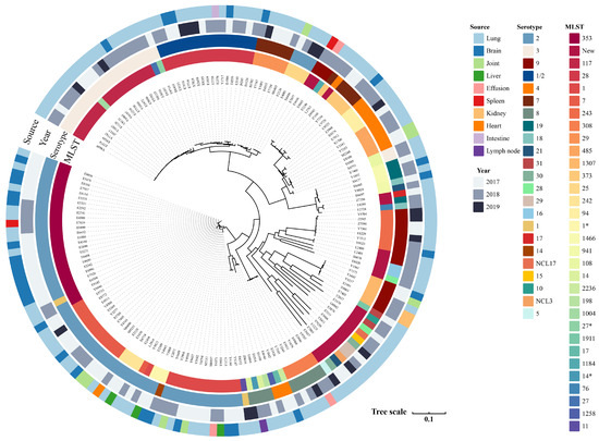 The sequence type of each isolate was annotated by SRST2 with default parameters. In addition, S. suis genome sequences were analyzed by BLASTn against a nucleotide database of serotype-specific genes in the CPS synthesis locus for molecular serotyping [42]. This identified 29 classical serotypes, with the exception of two pairs of serotypes: 1/14 and 2/.