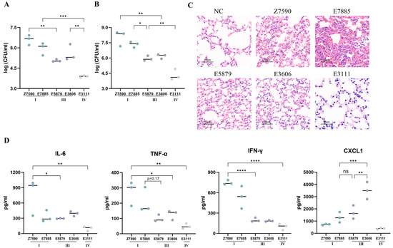 Excessive inflammation may also lead to death in mice. Cytokines and chemokines were measured in the plasma 12 h after the different strains were used to infect the mice (Figure 4D). The strains of cluster I all induced higher levels of interferon (IFN)-γ than those of cluster III (p < 0.001). Strain Z7590 in cluster I and both strains in cluster III showed significant differences in interleukin (IL)-6 and tumor necrosis factor (TNF)-α (p < 0.05), whereas strain E7885 did not. There were no significant differences in strains between the same VAF clusters. The chemokine C-X-C motif ligand (CXCL)1 was also detected. Interestingly, mice in cluster III with moderate mortality produced higher levels of CXCL1; specifically, strain E3111 produced 3 × higher CXCL1 expression than strain E7885 (p < 0.001). E3111 induced the lowest levels of IFN-γ, TNF-α, IL-6, and CXCL1.