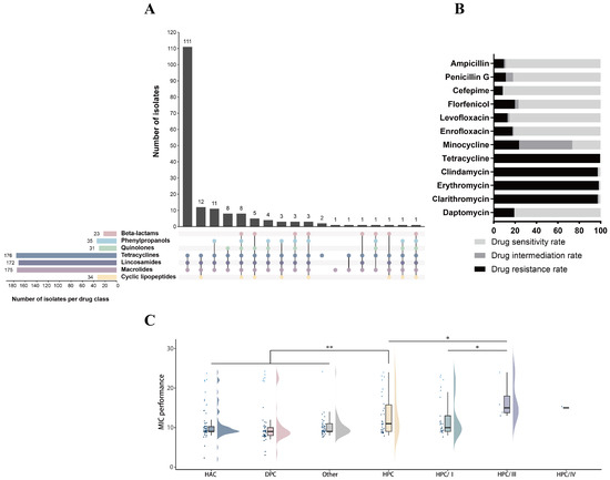 (A) Antibiotic resistance upset plot for Streptococcus suis, with horizontal bars showing antibiotic species and the number of isolates. The colored circles represent resistance to one antibiotic. Vertical bars represent the number of isolates with a particular combination of resistance. (B) Resistance ratios (black), mediator ratios (grey), and susceptibility ratios (light grey) are shown for each antibiotic drug. (C) Resistance phenotypes for each of the clades. Resistant = 2, mediator = 1, and sensitive = 0. The vertical axis is the sum of the values. A single asterisk (*) indicates p < 0.05 and double asterisks (**) indicates p < 0.01.