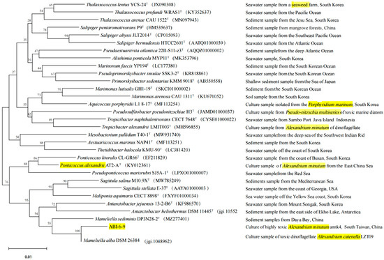 3.4. Phylogenetic Analysis of Strain ABI-6-9