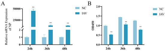 MLE-12 cells were cultured in 10% FBS RPMI 1640 and added to 6-well or 96-well plates. The experiment included a negative control (NC) group and an IAV group. In the IAV group, cells were infected with IAV for 4 h, then replaced with cell maintenance culture medium (2% FBS RPMI 1640) and cultured for 24 h, 36 h, or 48 h. At these time points, cells from the 6-well plates were collected for the RT-qPCR detection of influenza virus nucleoprotein (NP) mRNA. RNA was extracted using the SteadyPure Quick RNA Extraction Kit (AG21013, Changsha, China), reverse-transcribed into cDNA with the NovoStart® cDNA SuperMix Plus (E047-01B, Suzhou, China), and amplified using the NovoStart® SYBR qPCR SuperMix Plus (E099-01A, Suzhou, China). The reagent concentrations and cycling conditions are shown in Tables S1 and S2. The reactions were performed on a Roche LightCycler® 96 instrument (Hoffmann-La Roche AG, Basel, Switzerland). After completion, the melting curves were analyzed. GAPDH served as the internal reference gene, with relative quantification conducted through the 2−ΔΔCT method. Cells in 96-well plates were used for cell viability assays using a CCK8 kit (Ecotop Biotechnology Co., Guangzhou, China) according to the manufacturer’s protocol, and absorbance at 450 nm was measured using a microplate reader. The primers are shown in Table S3.