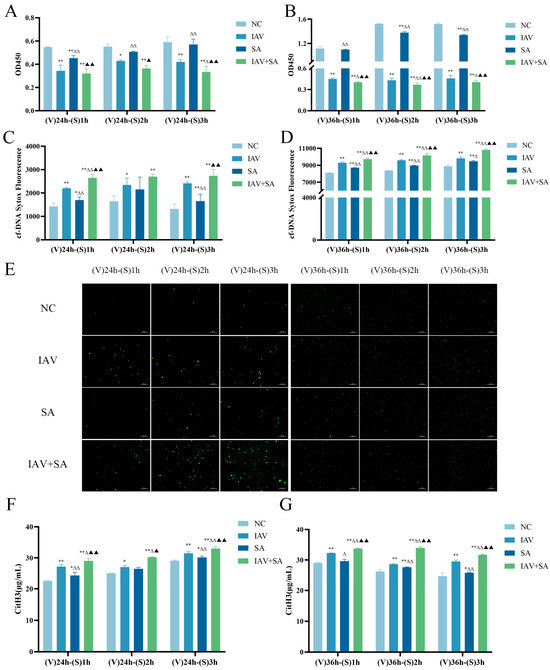 Effects of influenza virus combined with SA stimulation on lung epithelial cell viability and the levels of cfDNA and CitH3. MLE-12 cells were cultured in 10% FBS RPMI 1640. The IAV and IAV+SA groups were first infected with influenza virus for 4 h, followed by 2% FBS RPMI 1640 for 24 h/36 h. Subsequently, the SA and IAV+SA groups were stimulated with S. aureus for 1 h/2 h/3 h, with the NC group as a parallel control. Cell viability was measured by CCK-8 assay, cfDNA release was detected using SYTOX® Green Nucleic Acid Stain (Thermo Fisher Scientific, Waltham, WA, USA), and CitH3 levels were quantified via ELISA. (A,B) OD values of cell viability (n = 3). (C–E) Detection results and fluorescence micrographs of cfDNA in cell supernatants (n = 3). (F,G) CitH3 levels (μg/mL) in cell supernatants (n = 3). Compared with the NC group: * p < 0.05, ** p < 0.01; compared with the IAV group: Δ p < 0.05, ΔΔ p < 0.01; compared with the SA group: ▲ p < 0.05, ▲▲ p < 0.01. (V): influenza virus stimulation; (S): SA stimulation.
