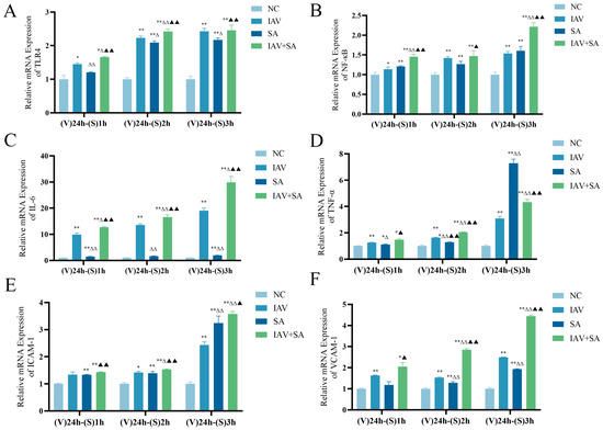 Effects of influenza virus combined with SA stimulation on TLR4, NF-κB, and inflammatory cytokine mRNA expression in lung epithelial cells. MLE-12 cells were cultured in 10% FBS RPMI 1640. The IAV and IAV+SA groups were first infected with influenza virus for 4 h, followed by 2% FBS RPMI 1640 for 24 h. Subsequently, the SA and IAV+SA groups were stimulated with SA for 1 h/2 h/3 h, with the NC group as a parallel control. mRNA expression levels of TLR4, NF-κB, and inflammatory cytokines were measured by RT-qPCR. (A–F) mRNA expression of TLR4, NF-κB, IL-6, TNF-α, ICAM-1, and VCAM-1 in cells (n = 3). Compared with the NC group: * p < 0.05, ** p < 0.01; compared with the IAV group: Δ p < 0.05, ΔΔ p < 0.01; compared with the SA group: ▲ p < 0.05, ▲▲ p < 0.01. (V): influenza virus stimulation; (S): SA stimulation.