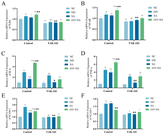 Previous findings have indicated that the co-stimulation of pulmonary epithelial cells with influenza virus and SA activates TLR4 and modulates the expression of downstream inflammatory factors. As TAK-242 is a specific inhibitor of TLR4 [28,29], we pretreated cells with TAK-242 prior to viral–bacterial co-stimulation to verify whether TLR4 regulates these inflammatory markers. The results demonstrated that TAK-242 intervention significantly reduced TLR4 mRNA levels compared with those in the corresponding control groups without the inhibitor (Figure 4A). Furthermore, mRNA expression levels of the downstream TLR4-associated markers NF-κB, IL-6, TNF-α, ICAM-1, and VCAM-1 were downregulated in the TAK-242-treated group (Figure 4B–F). These results suggest that TAK-242 suppresses TLR4 activation and downstream signaling, confirming TLR4’s regulatory role in these inflammatory pathways.