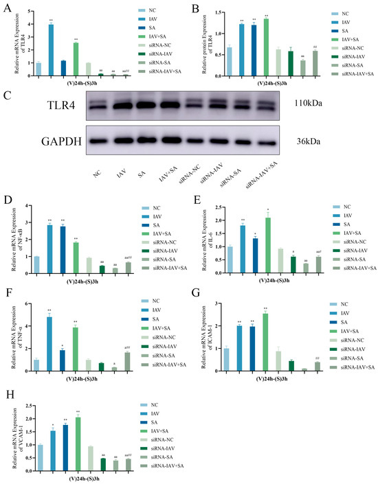 Changes in TLR4, NF-κB, inflammatory cytokine mRNA expression levels, and TLR4 protein expression levels in lung epithelial cells after TLR4 gene silencing. siRNA transfection groups (siRNA-NC group, siRNA-IAV group, siRNA-SA group, siRNA-IAV+SA group) were treated with TLR4-silencing siRNA for 6 h, while the siRNA-NC group was simultaneously treated with a negative control vector. Subsequent interventions followed the respective experimental protocols. Cells were collected 3 h post-intervention. RT-qPCR and Western blotting were used to verify TLR4 silencing efficiency, and RT-qPCR assessed mRNA expression changes in downstream markers. (A) TLR4 mRNA levels across groups after siRNA treatment (n = 3). (B,C) TLR4 protein expression levels across groups after siRNA treatment (n = 3). (D–H) NF-κB, IL-6, TNF-α, ICAM-1, and VCAM-1 mRNA expression levels post-siRNA treatment (n = 3). Compared with the NC group: * p < 0.05, ** p < 0.01; compared with the siRNA-NC group: a p < 0.05, aa p < 0.01; compared with the IAV+SA group: # p < 0.05, ## p < 0.01. (V): influenza virus stimulation; (S): SA stimulation.