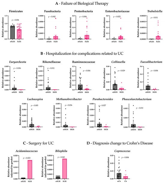 Gut microbiota differences between patient groups. (A) Patients who experienced a failure of biological therapy (Fail1) showed significantly increased levels of Proteobacteria, Fusobacteria, Enterobacteriaceae, and Trabulsiella, and decreased Firmicutes compared to patients who did not experience failure (nFail1). (B) Patients hospitalized for complications related to ulcerative colitis (Hos) exhibited lower levels of Euryarchaeota, Rikenellaceae, Ruminococcaceae, Faecalibacterium, Lachnospira, Methanobrevibacter, Parabacteroides, Phascolarctobacterium, and Collinsella compared to non-hospitalized patients (nHos). (C) Patients who underwent surgery for UC (Sur) had higher levels of Acidaminococcus and Bilophila compared to non-surgical patients (nSur). (D) Patients with a diagnosis change to Crohn’s disease (Ch) had lower levels of Coprococcus compared to those with no diagnosis change (nCh).