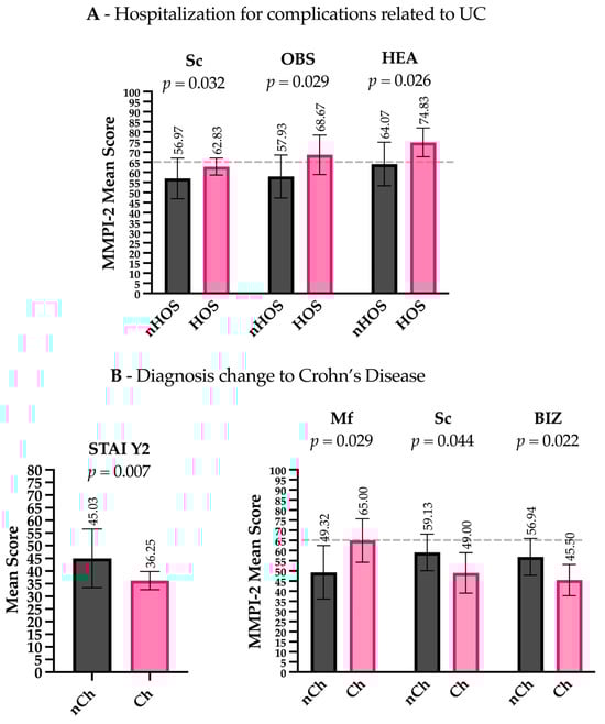 With regard to the psychometric tests, patients with higher scores on the Sc (Schizophrenia), OBS (Obsessivity), and HEA (Health Concerns) scales were associated with bad outcomes during the 5-year follow-up period. These results are partially consistent with the previous literature, with Viganò et al. [], 2018, showing an association with IBD extension and the prevalence of obsessive–compulsive symptoms. The significance of these scales identifies a psychopathological profile characterized by a marked preoccupation with their state of health, often in the absence of serious objectifiable organic symptoms, recurrent thoughts, and, as a likely coping strategy, a tendency towards perfectionism, and may develop compulsions to control the physical symptoms. Between patients that had an extension of inflammation and a change in their diagnosis, there were significantly higher scores on the Masculinity–Femininity scale (Mf), and significantly lower scores on the Schizophrenia scale (Sc) and the Bizarre Mentation scale (BIZ) compared to patients that maintained the UC diagnosis. Furthermore, people who were diagnosed as CD had a lower score in STAI Y2, indicating a lower trait anxiety. The Masculinity–Femininity (Mf) scale is a controversial scale in the MMPI-2—these scales indicate behaviors that deviate from gender stereotypes, which can be a source of difficulty in their relationship with society and their bodies, especially in a state of illness [].