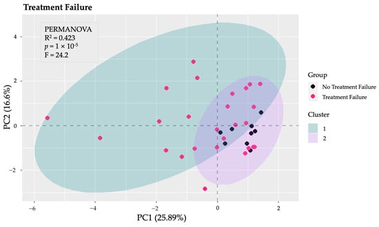 Principal Component Analysis (PCA) of gut microbiota at the phylum level. The PCA conducted on the phyla of the gut microbiota revealed significant differences between patients who experienced the failure of biological therapy (Fail1) and those who did not (nFail1), as indicated by PERMANOVA (p < 0.001), with an explained variance of 42.3%.