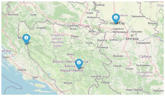 Geographical distribution of sampled Fomes fomentarius specimens across the Balkans. The map shows sampling localities in Croatia (FC), Bosnia and Herzegovina (FB), and Serbia (FS). The designated markers indicate specific collection sites: “Štrbački Buk” National Park (FC), Vrelo Bosne (FB), and “Fruška Gora” National Park (FS). (Map image sourced from Google Maps).