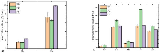 The mineral composition of F. fomentarius included two macroelements (Mg and Ca) and five microelements (Cr, Cu, Mn, Fe and Zn), as shown in Figure 2a,b.