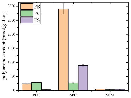 SPD was found to be the predominant PA across the strains, with concentrations ranging from 899.96 to 2910.09 nmol/g d.w., except in the FC strain, where its concentration was significantly lower (270.65 ± 14.72 nmol/g d.w.). The FB strain had the highest SPD levels (2910.09 ± 196.45 nmol/g d.w.). These findings indicate that SPD may be commonly present in F. fomentarius, although its concentration varied substantially among the analyzed strains. SPM was present in the lowest concentrations (32.67–54.35 nmol/g d.w.), with the FB strain again showing the highest level (54.35 ± 3.02 nmol/g d.w.). By contrast, PUT was predominant in the FC strain (278.56 ± 5.58 nmol/g d.w.), with concentrations higher than those reported for some edible wild mushrooms [,].