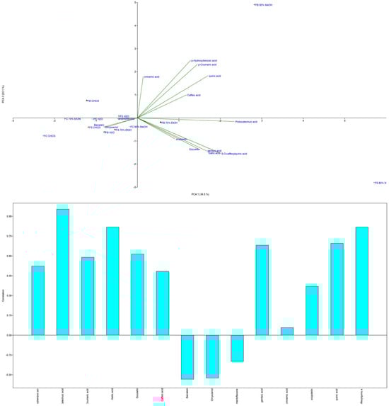 PCA analysis of Fomes fomentarius extracts and identified polyphenolics using LC-MS/MS analysis. Distribution of variables in (above) the score plot and (below) the loading plot of the first two principal components. The following abbreviations are used for the examined parameters: FB—strain sampled from Bosnia and Herzegovina; FC—strain sampled from Croatia; FS—strain sampled from Serbia; 70% EtOH—hydroethanolic extract prepared with 70% EtOH; H2O—hot water extract; 80% MeOH—hydromethanolic extract prepared with 80% MeOH; CHCl3—chloroform extract.
