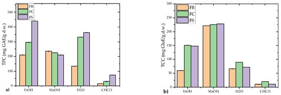 The total phenolic content (TPC) and total carbohydrate content (TCC) of F. fomentarius strains were evaluated across various extracts (Figure 5a,b).