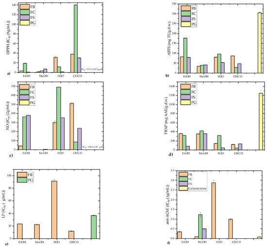 The antioxidant activities of F. fomentarius extracts were evaluated using DPPH, ABTS, NO scavenging, lipid peroxidation (LP) inhibition, and FRAP assays (Figure 6a–e).
