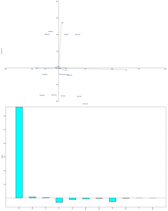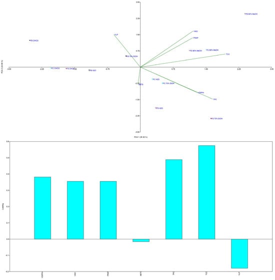 PCA analysis of analyzed Fomes fomentarius extracts and conducted antioxidant assays. Distribution of variables in (above) the score plot and (below) the loading plot of the first two principal components. The following abbreviations are used for the examined parameters: FB—strain sampled from Bosnia and Herzegovina; FC—strain sampled from Croatia; FS—strain sampled from Serbia; 70% EtOH—hydroethanolic extract prepared with 70% EtOH; H2O—hot water extract; 80% MeOH—hydromethanolic extract prepared with 80% MeOH; CHCl3—chloroform extract; DPPH–radical scavenger capacity against 2,2-diphenyl-1-picrylhydrazyl radical, DPPH•; ABTS—radical scavenger capacity against 2,2’-azino-bis(3-ethylbenzothiazoline-6-sulfonic acid), ABTS•+; NO—radical scavenging capacity against NO•; LP—lipid peroxidation assay; FRAP—ferric reducing antioxidant power.