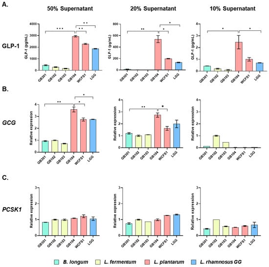 To select probiotic strains that effectively promote GLP-1 secretion, the human enteroendocrine cell line NCI-H716 was treated with the cell-free supernatant (CFS) of lactic acid bacteria at concentrations of 50%, 20%, and 10% for 2 h. Then, GLP-1 secreted by the NCI-H716 cells was measured by ELISA. L. plantarum GB104 showed the most striking ability to stimulate GLP-1 secretion, followed by L. plantarum WCFS1 and L. rhamnosus GG (LGG) (Figure 1A). In particular, the differences between strains were most evident when 20% CFS was used. Since GLP-1 is produced in enteroendocrine cells by cleavage of GCG by PCSK1 [18], we investigated whether the CFS of each strain affected the expression of these genes. The CFS of GB104 significantly increased GCG expression at 50% and 20%, but not at 10% dilution (Figure 1B). Unlike GCG expression, PCSK1 expression was not affected by the CFS of GB104 (Figure 1C). These results demonstrate that GB104 promotes GLP-1 secretion by increasing GCG expression, but not PCSK1 expression.