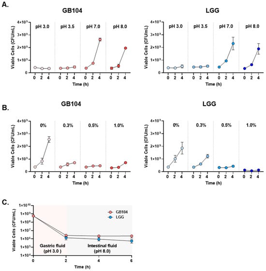 Based on a previous report [26], acid resistance tests of GB104 were performed at various pH levels and bile acid contents. LGG was used as a control strain. For the experiment, MRS medium was adjusted to a specific pH with HCl and NaOH or for a specific bile acid content by adding oxgall (BD Difoco, Franklin Lakes, NJ, USA). GB104 were inoculated into the MRS broth and cultured anaerobically at 37 °C for 4 h, and the number of viable cells was measured at 2 h intervals during culture. Viable cell counts were measured using a spread plate method and expressed as colony forming units (CFUs). In addition, to examine acid resistance in artificial gastrointestinal fluids mimicking the gastrointestinal environment, GB104 was incubated in pH 3.0 artificial gastric juice at 37 °C for 2 h and then incubated in pH 8.0 artificial intestinal juice at 37 °C for 4 h. The artificial gastric juice (Biochemazone, Leduc, AB, Canada) was adjusted to a final pH of 3.0 with NaOH, and the artificial intestinal juice (Biochemazone, Leduc, AB, Canada) containing 0.3% oxgall (BD Difoco, Franklin Lakes, NJ, USA) and 0.1% pancreatin (Sigma-Aldrich, St. Louis, MO, USA) was adjusted to a final pH of 8 with NaOH. When changing from artificial gastric juice to artificial intestinal juice, GB104 was harvested by centrifugation (8000 rpm for 5 min) and washed with PBS. Viable cell counts were measured at 2 h intervals during culture.