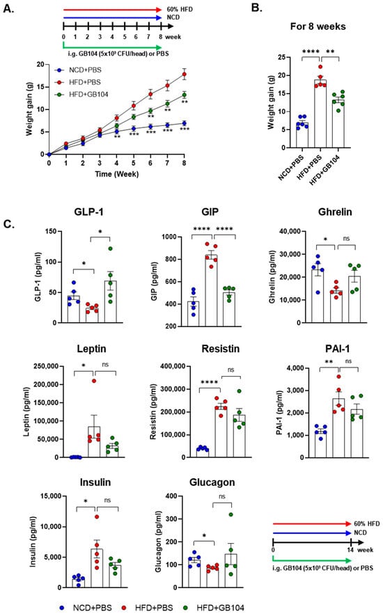 Effects of L. plantarum GB104 on weight gain and blood hormones in an HFD-induced obese mouse model. To determine whether L. plantarum GB104 suppresses weight gain, the body weights of mice were measured weekly (A), with the changes over 8 weeks presented as a bar graph (B). In addition, changes in blood hormone levels elicited by L. plantarum GB104 were examined (C). Mice used in this experiment were fed a 60% HFD for 14 weeks. Statistical analyses of the graph in (A) were performed relative to the HFD + PBS control group. NCD, normal chow diet; HFD, high-fat diet. All data are presented as mean ± SEM (n = 5–6 per sample). * p < 0.05; ** p < 0.01; *** p < 0.001; **** p < 0.0001; ns, not significant.