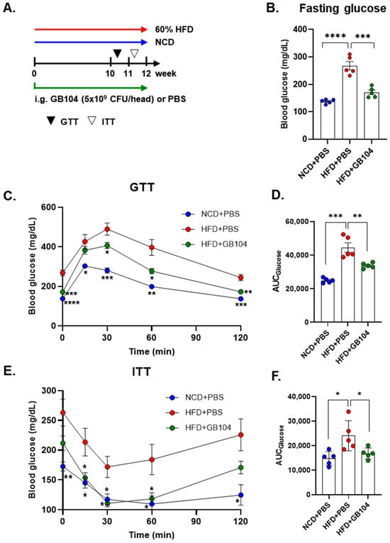 Effect of L. plantarum GB104 on blood glucose improvement in an HFD-induced obese mouse model. To investigate the effect of L. plantarum GB104 on blood glucose levels, GTT (B–D) and ITT (E,F) were performed according to the schedule outlined in the experimental design diagram (A). The experiments were performed after fasting, and glucose and insulin were administered intraperitoneally. Fasting blood glucose levels were measured before the GTT (B). The area under the curves (AUCs) of the GTT and ITT graphs were calculated to compare between groups. Statistical analyses of the graphs in (C,E) were performed relative to the HFD + PBS control group. NCD, normal chow diet; HFD, high-fat diet. All data are presented as mean ± SEM (n = 5–6 per sample). * p < 0.05; ** p < 0.01; *** p < 0.001; **** p < 0.0001.