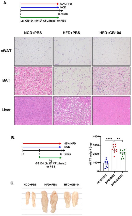 Effects of L. plantarum GB104 on fat accumulation in an HFD-induced obese mouse model. To determine whether L. plantarum GB104 inhibits fat accumulation, paraffin sections of liver and adipose tissues from mice fed a 60% HFD for 14 weeks were stained with H&E. Representative images are presented (A). Liver and epididymal white adipose tissue (eWAT) were observed at 100× magnification, and brown adipose tissue (BAT) was observed at 200× magnification. In addition, L. plantarum GB104 was orally administered daily to mice fed a 45% HFD for 8 weeks, and then the weights of eWAT samples were measured (B). Representative eWAT samples are presented in the photographic image (C). NCD, normal chow diet; HFD, high-fat diet. All data are presented as mean ± SEM (n = 10 per sample). ** p < 0.01; **** p < 0.0001.