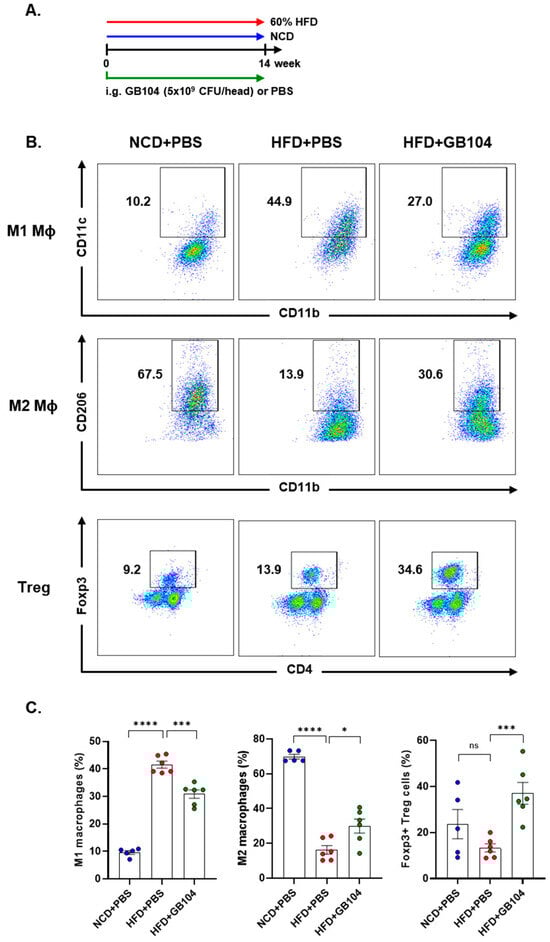 Effect of L. plantarum GB104 on immune cells in adipose tissue. Animal experiments were conducted according to the experimental design diagram (A). Subsequently, immune cells were then isolated from epididymal adipose tissues, and M1 and M2 macrophages, as well as Treg cells, were analyzed using flow cytometry. Representative results are presented as scatter plots (B), and overall results are presented as individual bar graphs (C). After gating the MHCII+F4/80+ cell population, M1 macrophages were identified as the CD11c+CD11b+ cell population, while M2 macrophages were identified as the CD11b+CD206+ cell population. Treg cells were identified as the CD4+Foxp3+ cell population after gating the TCRβ+ cell population. NCD, normal chow diet; HFD, high-fat diet. * p < 0.05; *** p < 0.001; **** p < 0.0001; ns, not significant.
